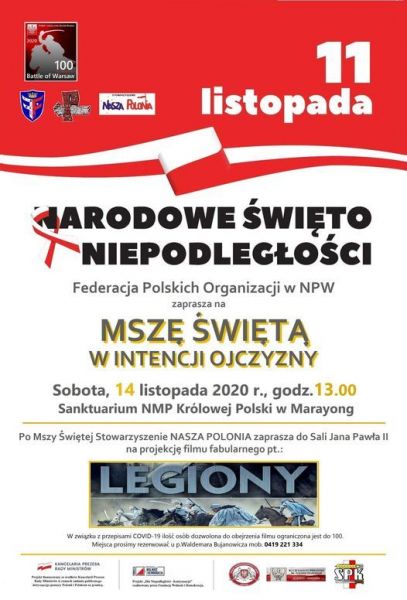 Federacja Polskich Organizacji w Nowej Południowej Walii zaprasza na Mszę Świętą w intencji Ojczyzny. Uroczysta msza odbędzie się w sobotę, 14 listopada 2020 roku o godzinie 13.00 w Sanktuarium NMP Królowej Polski w Marayong.