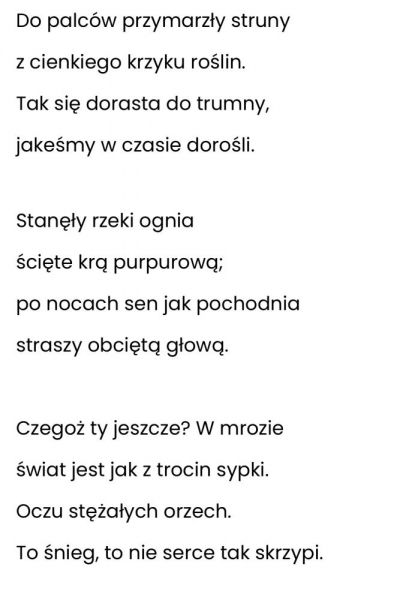 „I wyszedłeś, jasny synku, z czarną bronią w noc, i poczułeś, jak się jeży w dźwięku minut -zło. Zanim padłeś, jeszcze ziemię przeżegnałeś ręką. Czy to była kula synku, czy to serce pękło?”