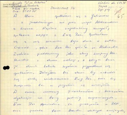 W związku z prowadzoną sprawą operac. Sprawdzania krypt. „FILOLOG” oraz realizacją planu przedsięwzięć operacyjnych w stosunku do figurantki, zachodzi konieczność bieżącego rozpoznania jej kontaktów oraz potwierdzenie, że zbiera informacje dot. spraw związanych z opozycją w kraju. Ustalono również, że interesuje się sprawami związanymi z obronnością kraju, w tym celu weszła w kontakt ze swoim bratem, zawodowym wojskowym, który jest oficerem W.P. W Tarnowskich Górach. Ostatnio zaczęła uczęszczać na kurs samochodowy w jednostce W.P. W Tarnowskich Górach, z racji tej ma możliwości swobodnego poruszania się po terenie tej jednostki. Poznała również szereg osób wojskowych. Informacje, które do tej pory zostały zebrane w ramach sprawy sugerują, że może ona być wykorzystywana przez obyw. RFN do zbierania informacji wywiadowczych.
