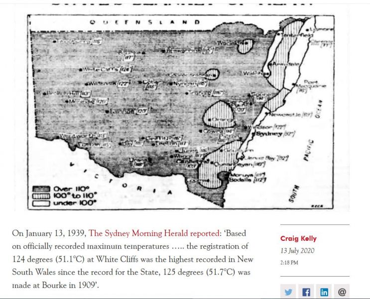Dokonał tego między innymi reporter Spectatora, Craig Kelly, który zademonstrował, że Biuro Meteorologii usuwa dane, które nie zgadzają się z oficjalną teorią „globalnego ocieplania”. I tak według ostatnich doniesień ABM najgorętszym dniem w historii Australii był 17-ty grudnia 2019 roku, którego to dnia Biuro Meteorologii zanotował temperaturę 40,9 stopni Celsiusza (link do sprawdzenia). Tymczasem Craig Kelly cytuje inne ogłoszeni z 1939 roku gdzie to samo Biuro Meteorologiczne ogłaszało temperatury wyższe od 50 stopni Celsjusza w kilkunastu miejscach od Queensland po Wiktorię. Dziwnym zbiegiem okoliczności temperatury te znikły obecnie z oficjalnych arkuszy Australijskiego Biura Meteorologii. |