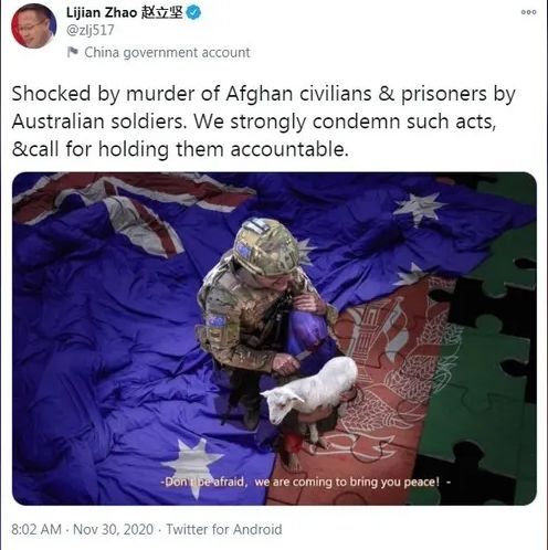 Ostatnim wydarzeniem potęgującym psujące się gwałtownie stosunki pomiędzy Chinami i Australią był wpis na Twitterze chińskiego zastępca dyrektora generalnego Ministerstwa Spraw Zagranicznych Zhao Lijian, w którym umieszczone było podrobione zdjęcie australijskiego żołnierza podcinającego gardło afgańskiemu dziecku.
