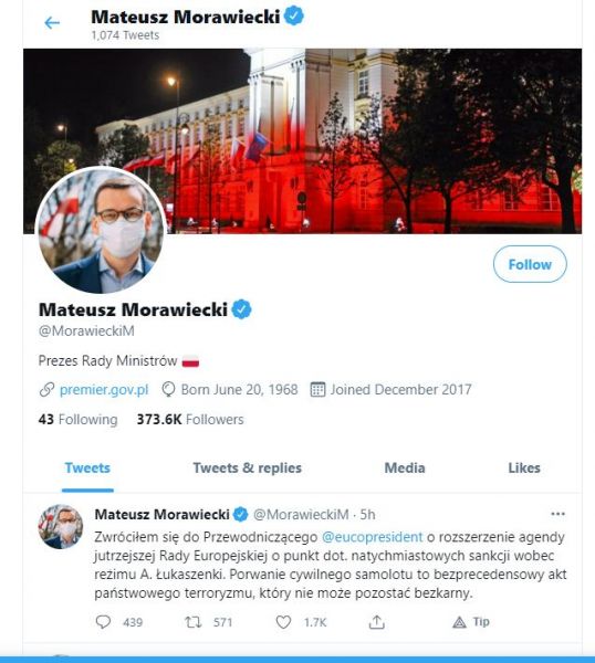 Premier Mateusz Morawiecki, odnosząc się do zatrzymania białoruskiego opozycjonisty Romana Protasiewicza oraz wymuszenia lądowania wypowiedział się na Twiterze: