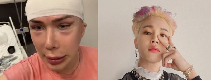 Oli London tuż po operacji a po prawej jego idol Jimin z grupy BTS