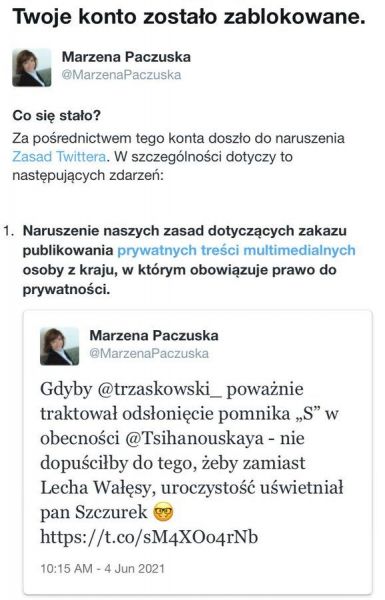 Twitter zbanował byłą szefową "Wiadomości" TVP Marzenę Paczuską za następujący wpis: