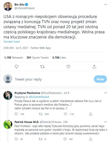 Projekty nowelizacji ustawy wywala poważne zaniepokojenie chargé d'affaires ad interim ambasady USA w Polsce czyli pana Bixa Aliu, który na Twitterze podzielił się swoją opinią na ten temat: