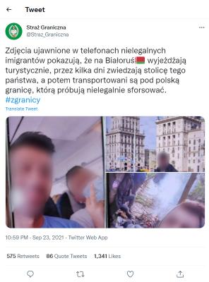 Straż Graniczna opublikowała w czwartek na Twitterze zdjęcia z telefonów imigrantów, które pokazują, że na Białoruś wyjeżdżają turystycznie, a następnie kilka dni zwiedzają Mińsk. Potem transportowani są pod polską granicę.