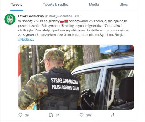 Jak poinformowała w niedzielę rano na Twitterze Straż Graniczna, w sobotę odnotowano 259 prób nielegalnego przekroczenia granicy z Białorusi do Polski. Funkcjonariusze zatrzymali 18 nielegalnych imigrantów.