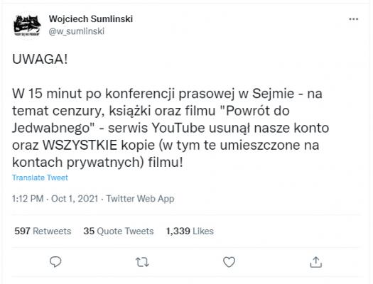Portal "wPolityce" cytuje wpis Wojciecha Sumlińskiego z Twittera, w którym autor filmu "Powrót do Jedwabnego" informuje o zamknięciu jego konta na mediach społecznościowych "YouTube" za rzekomy antysemityzm.