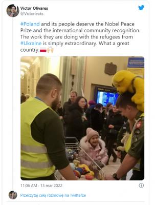 Polska i jej mieszkańcy zasługują na Pokojową Nagrodę Nobla i uznanie społeczności międzynarodowej. Praca, jaką wykonują z uchodźcami z Ukrainy jest po prostu niezwykła.