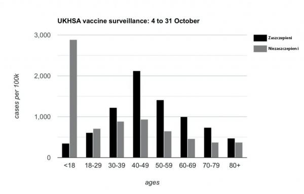 „Świeższe informacje wzmocniły obserwacje letnie. W każdej grupie wiekowej powyżej 30. roku życia w Wielkiej Brytanii wskaźniki zakażenia Covid na 100 000 są obecnie wyższe wśród zaszczepionych niż nieszczepionych. Rzeczywiście, w kohortach w wieku od 40 do 79 lat wskaźniki infekcji wśród zaszczepionych są ponad dwukrotnie wyższe niż wśród nieszczepionych."