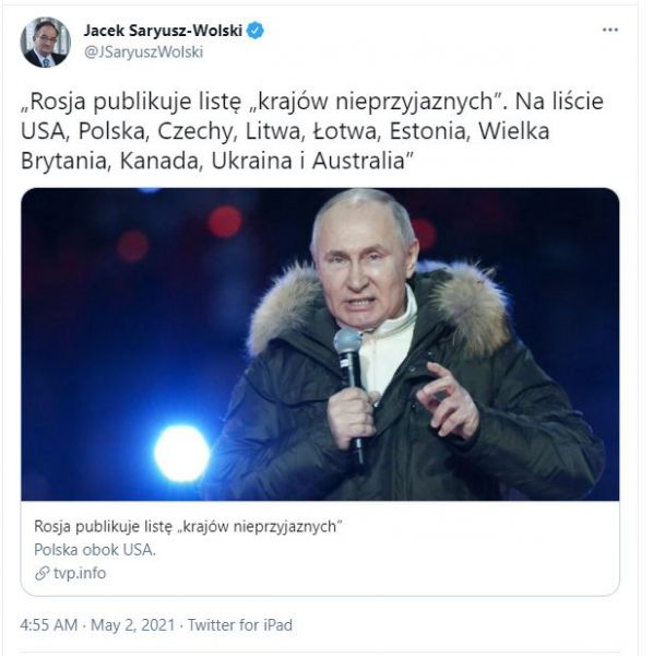 Rosyjska państwowa telewizja Rossija 1 opublikowała listę „krajów nieprzyjaznych”, którą wcześniej zapowiedział szef rosyjskiego MSZ Siergiej Ławrow. Wśród dziesięciu państw znalazły się Polska i Australia.