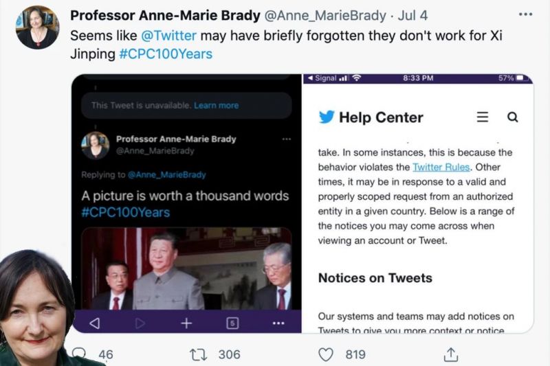 Twitter zawiesił czasowo konto pracownika akademickiego, profesorki Anne-Marie Brady z Uniwersytetu Cantenbury za robienie drwiących uwag na temat prezydenta Chin Xi Jinpinga z okazji celebracji 100 letniej rocznicy ustanowienia Komunistycznej Partii Chin.