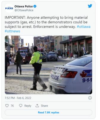 Mimo to policja w Ottawie aresztowała „kilka osób” pod zarzutem "nielegalnego" dostarczanie dóbr materialnych demonstrantom „Konwoju Wolności”.