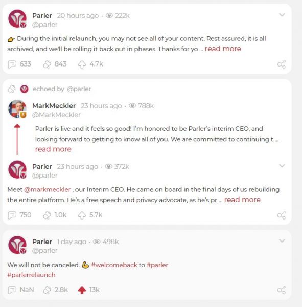 W pierwszych wpisie na nowo otworzonych mediach, zarząd Parlera ogłosił tryumfalnie: