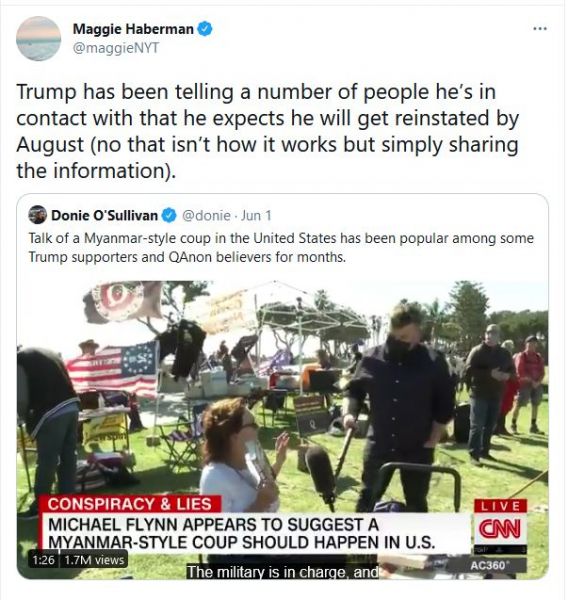 Według tejże dziennikarki, niejakiej Maggie Haberman, Donald Trump rozpowiada wszystkim że zostanie przywrócony na stanowisko prezydenckie już w sierpniu tego roku.