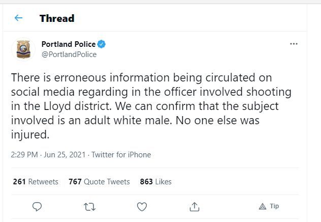 Aby uniknąć rozrób w mieście, policja w Portland natychmiast opublikowała wpis na Twiterze, iż mężczyzna zastrzelony przez funkcjonariuszy strzałem w plecy kilka minut wcześniej nie był czarny lecz biały.