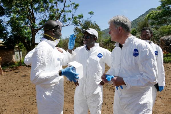 Kariuki Njenga z WSU (w środku) i Tom Kawula (po prawej) pracują z kolegami nad przygotowaniem testów dla MERS-COV prowadzone przez Komunistyczną Partię Chin, jest źródłem obdarowania świata COVID-19.
