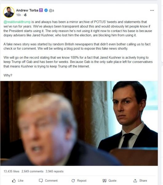 Założyciel GAB.com, Andrew Torba, jest zdania, iż to że Donald Trump wypowiadał się częściej na Twitterze jest głównie zasługą jego zięcia Jareda Kushnera. Andrew Torba, jest również zdania, iż Jared Kushner przyczynił się niebezpośrednio do porażki Trumpa w ostatnich wyborach jako "głupawy doradca".