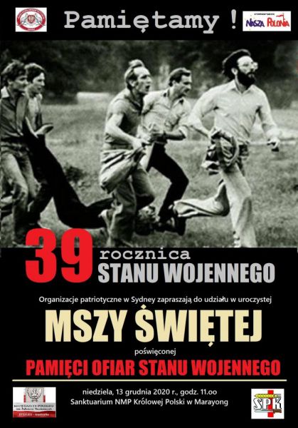 Organizacje patriotyczne w Sydney zapraszaja do udzialu w uroczystej Mszy Swietej poswieconej pamieci ofiar stanu wojennego, ktora odprawiona zostanie w Kosciele Matki Bozej Czestochowskiej Krolowej Polski w Marayong dnia 13 grudnia 2020 roku, poczatek godzina 11.00.