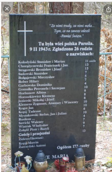 Wkrótce po zagładzie Parośli doszło do kolejnych masowych zbrodni. Według Ewy Siemiaszko, która od trzech dekad prowadzi badania i dokumentuje ludobójstwo dokonane na polskich mieszkańcach Wołynia, na samym Wołyniu życie straciło około 60 tysięcy Polaków, a w innych rejonach, gdzie działała UPA, około 70 tysięcy.