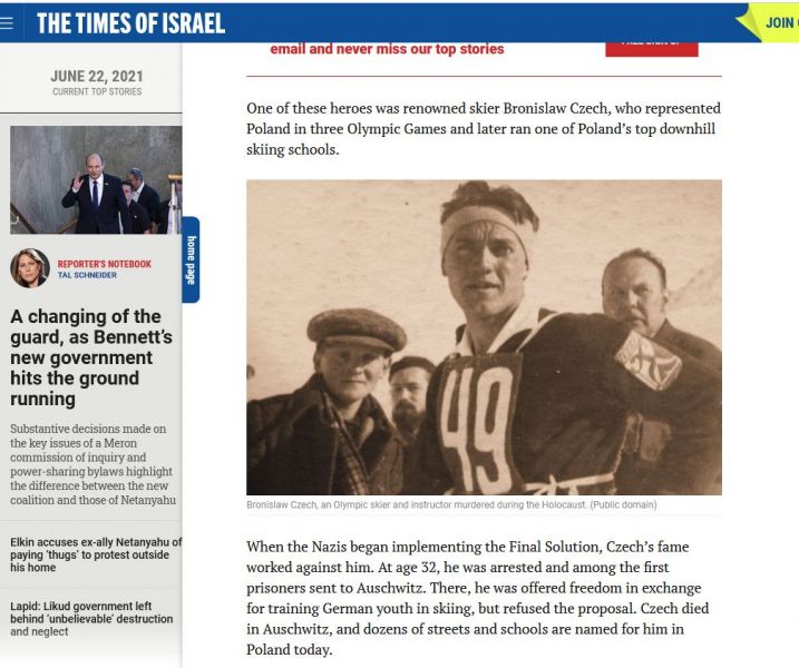I tak w 2016 roku „Times of Israel”, jeden z większych dzienników w Izraelu, wydrukował łzy wyciskający artykuł, z którego dowiadujemy się, iż jeden z bohaterów polskich sportów zimowych a czasie okupacji konspirator i członek AK był Żydem. Mowa tu o Bronisławie Czechu.