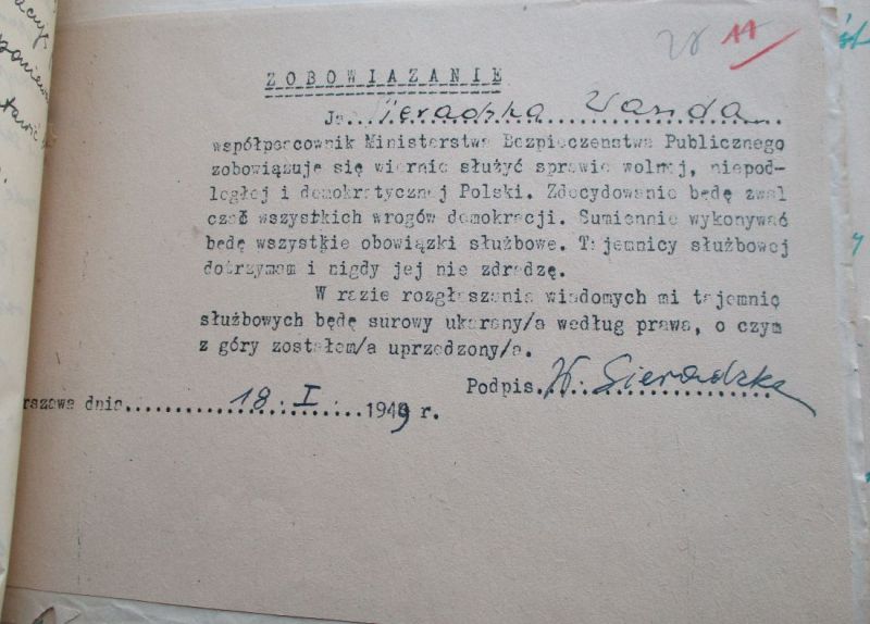 Zacznijmy od najważniejszego faktu. Pani Wanda była zatrudniona przez pewien czas jako pracownica UB. Z tego powodu skrupulatni biurokraci UB założyli jej teczkę personalną (sygnatura IPN -BU-1005-7096). To nie jest ważne, że okres zatrudnienia Wandy Sieradzkiej przez MBP, był bardzo krótki. Ważne jest to, że to ona sama chciała być w tym ministerstwie zatrudniona i ubiegała się o przywilej ten dwukrotnie. To nie z braku chęci współpracy została z UB usunięta ale ze względu na jej …... powiedzmy sobie, rozrywkowy tryb życia, który nie podobał się większości jej zwierzchników.
