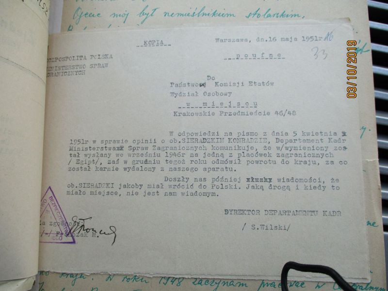 We wrześniu 1946 r. siostra ob. Sieradzkiego, a żona gen. Świetlika, będąca wówczas na stanowisku Dyr. Biura Personalnego Min. Handlu i Żeglugi, spowodowała skierowanie w/w do MSZ za pośrednictwem Dep VII. Jak informuje nas Dyrektor Biura Personalnego MSZ, ob. Wilski, paszporty na wyjazd na placówkę do Egiptu zostały wydane Sieradzkiemu oraz jego żonie przez MSZ. Po niespełna 2 miesiącach Sieradzcy samowolnie opuścili placówkę w Egipcie i uzyskawszy w Marsylii podstępem rozszerzenie paszportu na Palestynę uciekli do Tel-Avivu. Jak wynika z informacji ówczesnego posła R.P. w Kairze (wiadomość tę potwierdza zresztą i Dep VII) ob. Sieradzka związana była na terenie Egiptu z żydowskimi oficerami IS. W Palestynie Sieradzcy nigdzie nie pracowali i powrócili do kraju w lipcu 1948 roku.