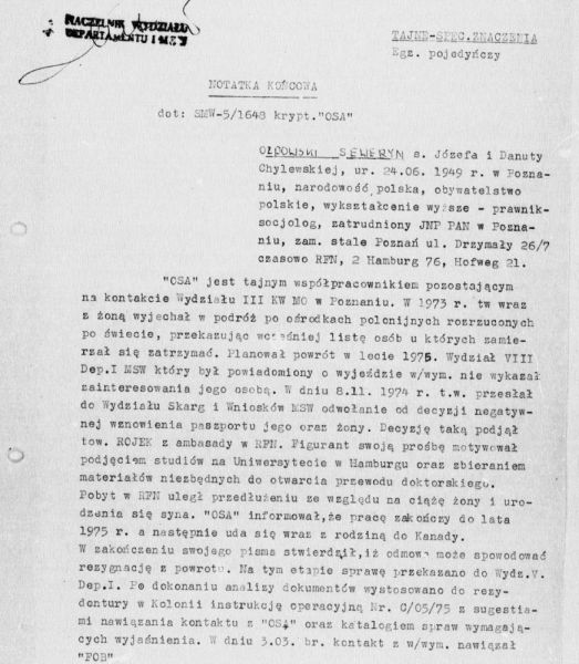 W trakcie rozmowy ustalił, iż „Osa” w maju 1975 r. wyjeżdża wraz żoną i synem do Sydney, celem dokończenia studiów doktoranckich. W RFN nie może pozostać dłużej ze względu na nieuregulowany status. W przypadku negatywnego załatwienia jego spraw paszportowych zamierza wyjechać do USA, występując o zmianę obywatelstwa.