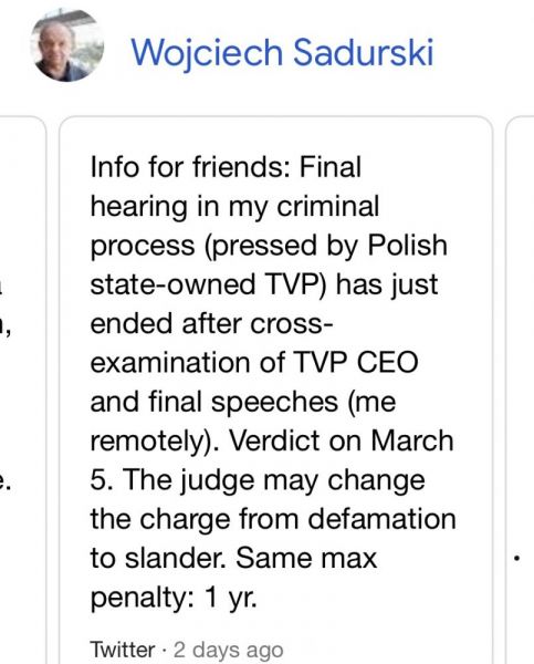 W dniu 5 marca 2021 zapadnie wyrok w sprawie prof. Wojciecha Sadurskiego- skandalisty politycznego, którego publiczne wypowiedzi wiążą się z obrażaniem polskich wyborców, kolegów z Uniwersytetu Warszawskiego, Prezydenta RP czy Prezesa partii Prawo i Sprawiedliwości.