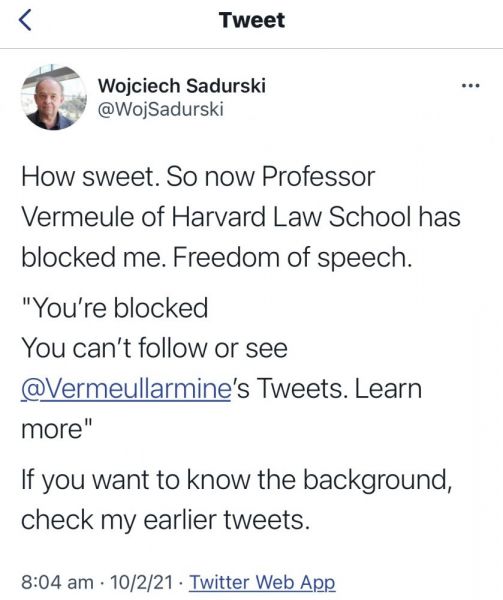 Profesor Wojciech Sadurski, którego ojciec był w latach 1951- 1954 sekretarzem Naczelnej Rady Adwokackiej, a potem podsekretarzem stanu w Ministerstwie Sprawiedliwości PRL, kończąc w komunistycznym Sejmie PRL, kontynuuje dzieło swojego ojca- jest naczelnym niszczycielem wszystkiego, co nie lączy się z jego i tylko jego przekonaniami politycznymi. Powiązany z Komitetem Obrony Demokracji, Gazetą Wyborczą, TWN i obozem opozycji stał się twarzą propagandową tychże organizacji propagandystycznych, wykorzystujac przy okazji swoj status profesora najstarszego Uniwersytetu w Sydney. Od lat nie ma chętnych do wysłuchania jego wykładów na Uniwersytecie w Sydney na temat obecnej sytuacji politycznej w Polsce. Ale przyjedzie, "cyknie zdjecie" z kim trzeba i wraca do Polski judzić czy pokazywać swoją popularność na Twiterze.