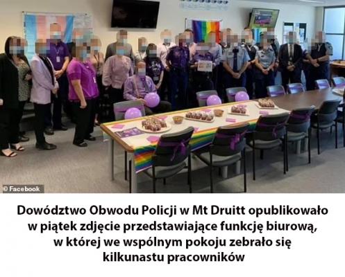 Dowództwo Policji Mount Druitt opublikowało na Facebooku zdjęcia przedstawiające kilkunastu pracowników zebranych w pomieszczeniach biurowych, aby celebrować Wear It Purple Day (Wear it Purple Day - to coroczny dzień świadomości LGBTIQA+ przeznaczony specjalnie dla młodych ludzi w Australii. Popierający ten ruch ubierają się na fioletowo, aby uczcić różnorodność i młodych ludzi ze społeczności LGBTIQA+).