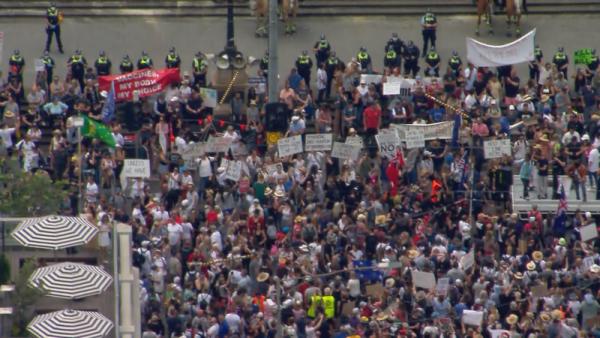 Ludzie zaczęli gromadzić się przed Biblioteką Stanową w centrum w Melbourne. Wielu niosło transparenty z sentymentem antyszczepionkowym, a niektórzy antyrządowe, zawierające treści o „niebezpiecznym nowym ustawodawstwie”.
