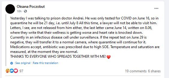 Jak pisze Oksana Poczobut, Andrzejowi zrobiono test na COVID, ale dopiero 16 czerwca. Na kwarantannie ma pozostawać 21 dni, czyli do 8 lipca. Obecnie został przeniesiony z przepełnionej dusznej celi na obserwację, jest na sali dla osób z chorobami zakaźnymi. Żona więźnia dowiedziała się, że 29 czerwca Andrzej będzie miał powtórzony test, jeśli okaże się on negatywny, wróci do zwykłej celi, gdzie będzie kontynuował kwarantannę. Nie wiadomo jednak, czy władze kolonii pozwolą mu leżeć na pryczy w ciągu dnia. Na razie przyjmuje leki, z racji wysokiego poziomu OB przepisano mu antybiotyk.