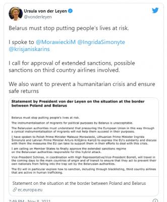 Wykorzystywanie „migrantów do celów politycznych jest niedopuszczalne”, powiedziała w oświadczeniu, dodając, że UE przyjrzy się również, jak ukarać „linie lotnicze z krajów trzecich”, które przywożą migrantów na Białoruś.