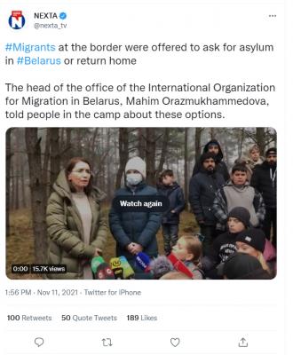 Na swoim kanale na Twitterze Nexta opublikowała nagranie, na którym kierująca białoruskim biurem Międzynarodowej Organizacji ds. Migracji Mahim Orazmukhammedova oznajmia zgromadzonym pod granicą migrantom tę decyzję.