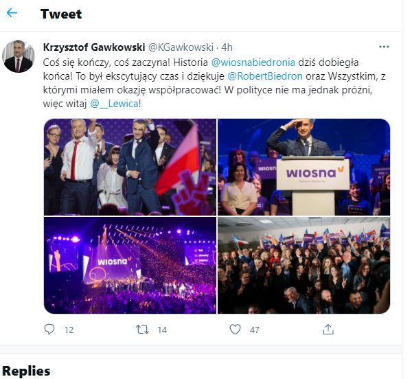 Chodzi oczywiście o przyjaźnie do ideologii LGBTQ nastawionej partii politycznej Roberta Biedronia. Portal 300polityka.pl podał po godzinie 18.30, że zgromadzenie ogólne Wiosny – partii założonej przez Roberta Biedronia – podjęło decyzję o samorozwiązaniu partii.