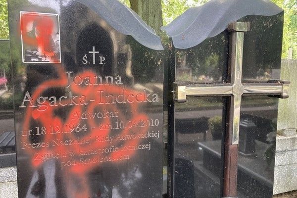 Nieznani sprawcy zniszczyli nagrobek mecenas Joanny Agackiej-Indeckiej, ofiary katastrofy smoleńskiej pochowanej na Starym Cmentarzu w Łodzi. Płyta pomnika została zamalowana czerwoną farbą. Zniszczono m.in. napisy znajdujące się na nagrobku oraz zdjęcie adwokat.