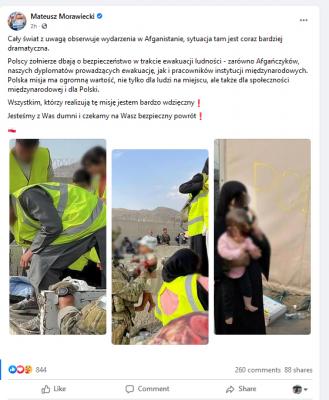 Trwa ewakuacja z Afganistanu cudzoziemców i obywateli tego kraju, którzy wspierali wojska NATO. Zdjęcia z trudnej akcji, prowadzonej na lotnisku w Kabulu z udziałem polskich żołnierzy,zamieścił na swoim profilu na Facebooku premier Mateusz Morawiecki.