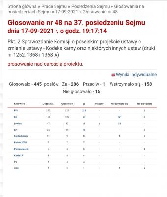 Przeciw ustawie głosowały Koalicja Obywatelska (z wyjątkiem dwóch głosów za) i większość Lewicy (11 głosów za i 1 wstrzymujący). Poparły ją poza Zjednoczoną Prawicą i kołem Kukiz’15 także Koalicja Polska (PSL), Porozumienie, koło Polskie Sprawy, Konfederacja i Polska 2050.