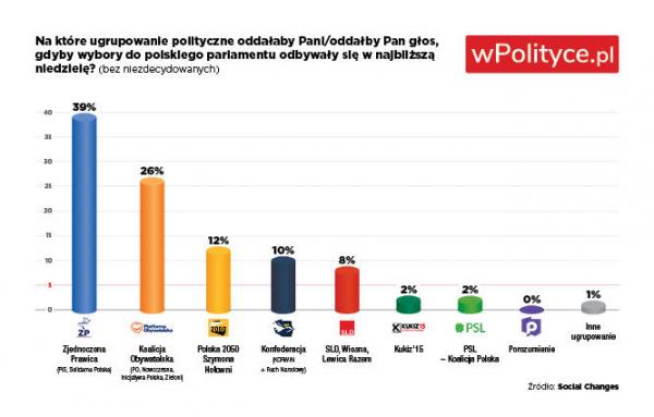 Według najnowszego badania pracowni Social Changes na zlecenie portalu wPolityce.pl, dwa największe ugrupowania na scenie polityczne zachowują swoje poparcie; ani PiS, ani PO, nie zyskały, ale też nie straciły punktów w ostatnim tygodniu. W górę Konfederacja oraz Lewica. Do Sejmu weszłoby pięć ugrupowań.