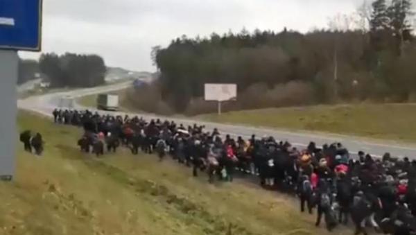 W drodze do granicyMedia niezależne białoruskie publikują w poniedziałek rano nagrania z mediów społecznościowych, na których widać setki migrantów z plecakami i śpiworami, idących szosą w kierunku przejścia granicznego z Polską Kuźnica Białostocka Bruzgi. Ludziom tym towarzyszą uzbrojeni ludzie w mundurach.