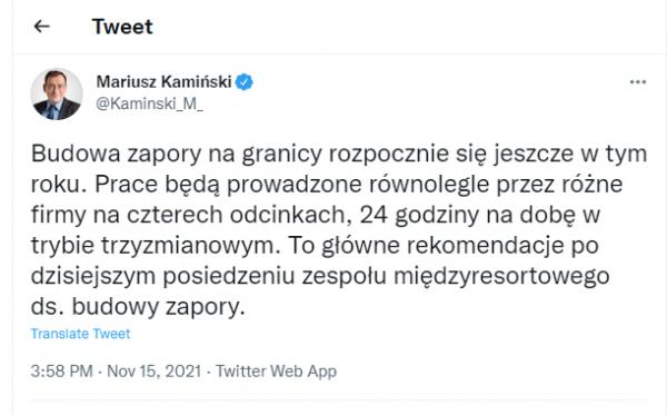 „Budowa zapory na granicy rozpocznie się jeszcze w tym roku. Prace będą prowadzone równolegle przez różne firmy na czterech odcinkach, 24 godziny na dobę w trybie trzyzmianowym” – napisał Kamiński.