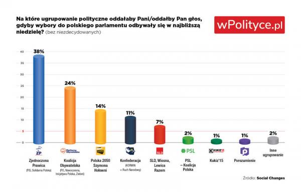 Najnowszy sondaż poparcia dla partii politycznych, zrealizowany przez pracownię Social Changes na zlecenie portalu wPolityce.pl, potwierdza wyraźną stabilizację na scenie politycznej. Prawo i Sprawiedliwość zachowuje wyraźne prowadzenie. Traci Lewica, zyskuje Konfederacja.