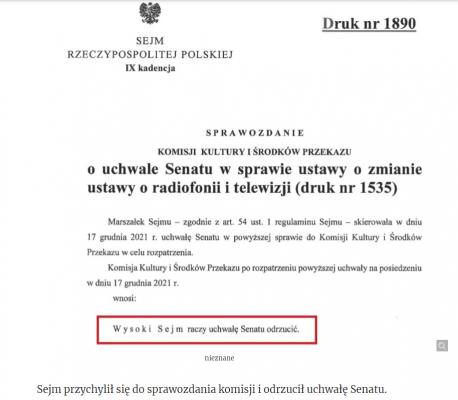 W piątek na godz. 13 została zwołana sejmowa komisja kultury i środków przekazu, która zajęła się ustawą o radiofonii i telewizji. We wrześniu odrzucił ją Senat.