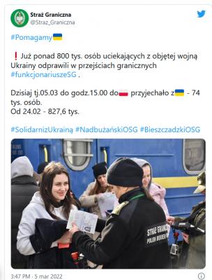 Z danych opublikowanych w sobotę na oficjalnym profilu Straży Granicznej na Twitterze wynika, że od początku rosyjskiej inwazji na Ukrainę, a więc od 24 lutego, do Polski przyjechało 827,6 tys. uchodźców z tego kraju.