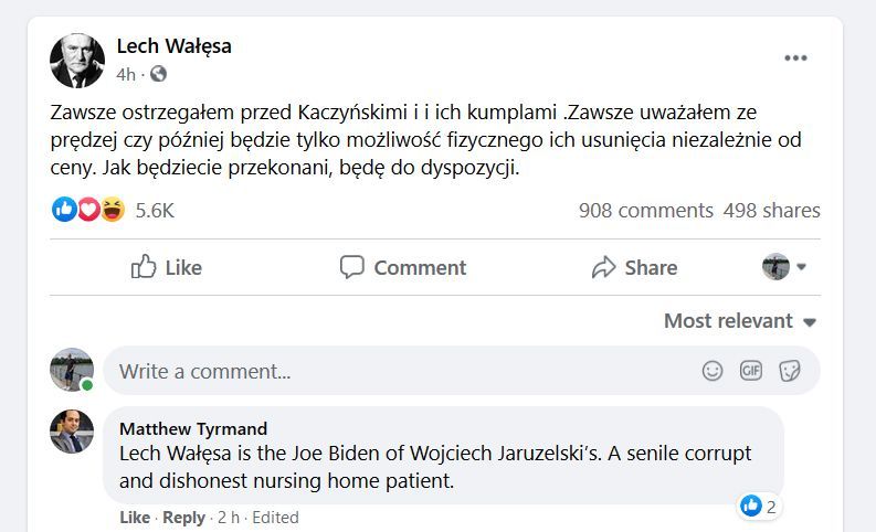 Ciekawy jest komentarz Matthew Tyrmanda pod wpisem Lecha Wałęsy: