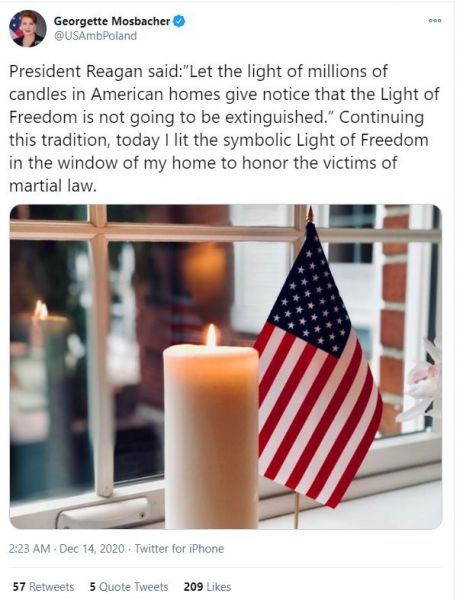 Prezydent Reagan powiedział: „Niech płomień milionów świec w amerykańskich domach będzie świadectwem, że Światło Wolności nie zostanie zgaszone”. Kontynuując tę tradycję, zapaliłam dziś symboliczne Światło Wolności w oknie mojego domu, aby uczcić ofiary stanu wojennego. (LINK)