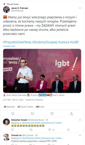 Szczególnie mocna była tutaj pozycja niejakiego Jakuba Pietrzaka. Pozycja ta jest jasno odzwierciedlana na jego koncie na Twitterze. Wypowiada się tam następująco:
