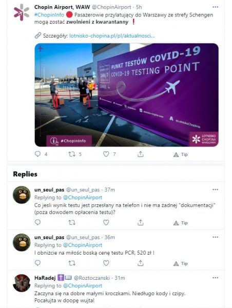 Po komunikatem Lotniska Chopina na Twitterze pojawiły się na ogól nieprzychylne komentarze internautów. Często chodzi tu o ceny testów o których przypomniał zarząd lotniska - szybki test antygenowy kosztuje 200 zł, test RT-PCR – 520 zł.