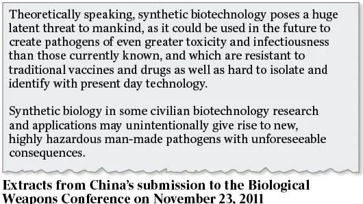 Rząd Chin przyznał się do prowadzenia badań nad "produkcją" wirusów, oraz stwierdził, iż badania takie stanowią utajone zagrożenie dla ludzkości. Dodatkowo rząd chiński wspomniał o możliwości nieumyślnego "wypuszczenia" któregoś z takich wirusów „na wolność”, podczas konferencji ONZ na temat broni biologicznej.